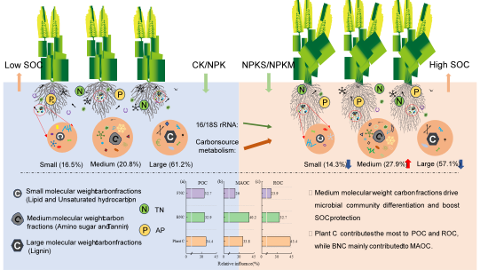 土壤溶解有机物(DOM)在陆地生态系统的能量和养分循环中至关重要,显著影响土壤微生物的多样性及群落结构。然而,长期有机替代(秸秆和粪肥)对DOM的分子组成以及其与土壤有机碳(SOC)组分和微生物群落结构的关系,尤其是在潮土中,尚未得到充分探索。通过对河南省农业科学院“国家潮土肥力与肥料效益长期监测站”的数据监测与分析,研究发现,长期有机替代显著提高了复杂有机分子(CHONs、CHOSs、CHONSs)的丰度,同时降低简单化合物(CHOs)丰度。DOM中分子量碳组分(氨基糖类、碳水化合物类、单宁类和多稠芳烃类)总占比增加(31.1%-32.5%),而大分子量(木质素类:6.81%-8.10%)和小分子量(不饱和烃类、脂质类和多肽类:1.62%-13.0%)碳组分占比下降,DOM中分子量碳组分更有助于促进土壤SOC的固存。此外, 微生物群落(真菌和细菌)的模块化以及碳源利用微生物的丰度、多样性,与DOM中分子量碳组分呈显著正相关,进而增强了微生物群落的稳定性。真菌群落对DOM中分子量碳组分的敏感性高于细菌群落。研究结果突出了DOM的中分子量碳组分在驱动微生物群落结构的分化及提高SOC固存的关键作用。研究结果以“Medium molecular weight carbon fractions of DOM: Driving soil microbial community differentiation and soil organic carbon sequestration”为题于2025年4月18日在线发表在《Agriculture, Ecosystems and Environment》。