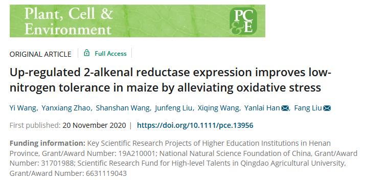 Plant, Cell & Environment(影响因子6.362)在线发表了题为Up‐regulated 2‐alkenal reductase expression improves low‐nitrogen tolerance in maize by alleviating oxidative stress的研究论文,揭示了玉米烯醛还原酶基因通过缓解低氮胁迫导致的细胞氧化胁迫,并提高植株氮吸收能力和同化能力从而提高玉米氮利用效率。