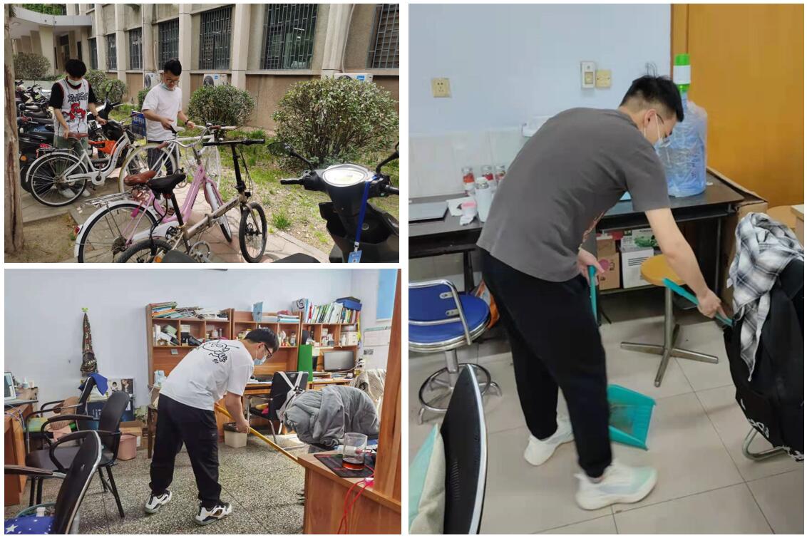 党员们走进了18号楼和20号楼,在征得老师和同学们同意后,为实验室、自习室开门开窗通风透气,清理窗台、桌面灰尘,清扫地面垃圾、拖地。党员们还将楼下的自行车、电动车摆放整齐,将周围落叶、纸屑等垃圾清扫干净。给师生营造了一个干净、整洁的工作和学习环境。