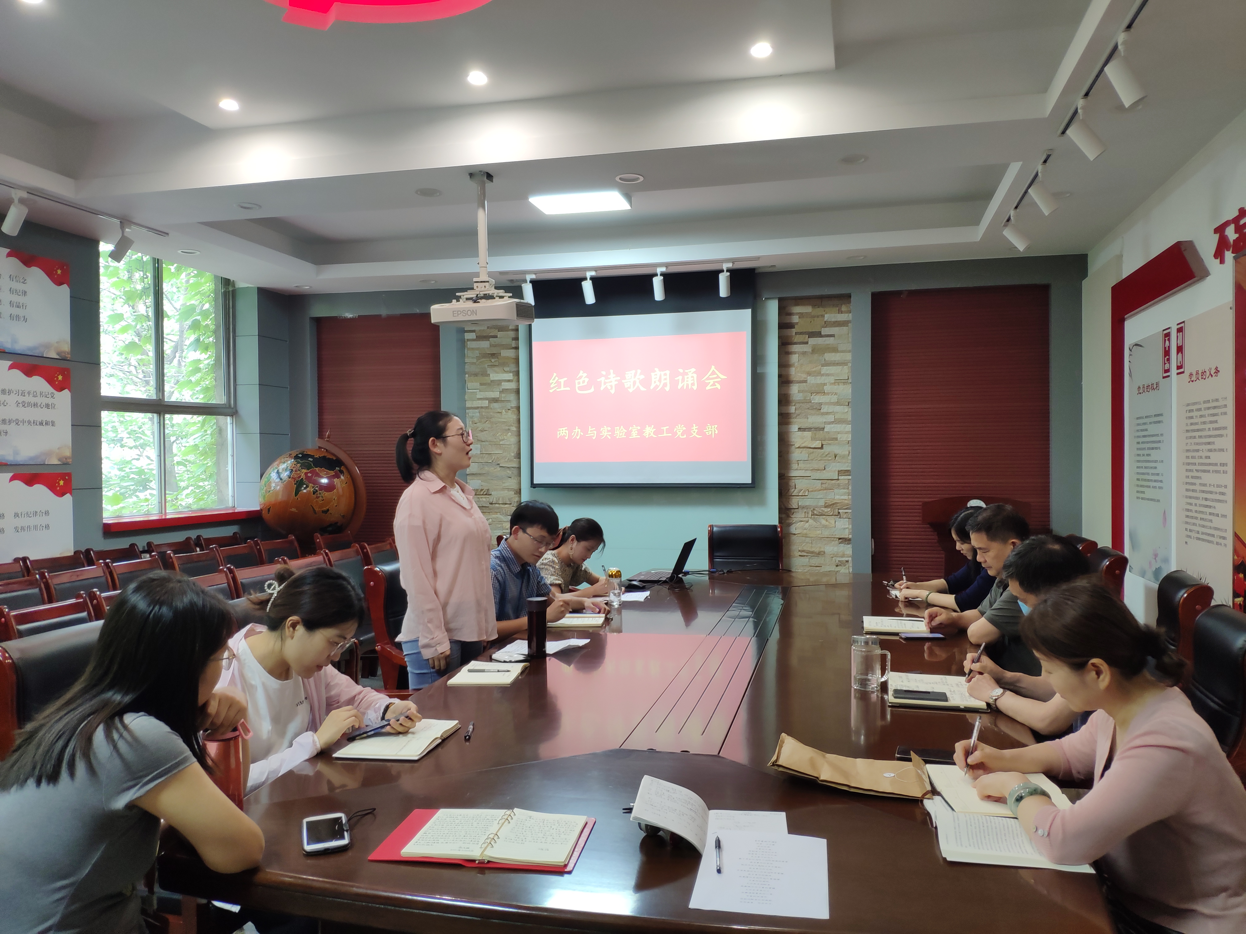 微党课活动结束后,支部组织开展了红色诗歌朗诵活动。王岚同志以《面对鲜红的党旗》为题,深情回望党的奋斗历程,热情讴歌党的丰功伟绩;盛开同志朗诵了毛主席的著名诗篇《沁园春·长沙》,声情并茂地展现了革命青年豪情奔放的青春风采;王俊倩同志深情朗诵了《可爱的中国》,让方志敏烈士正气凛然、坚贞不屈的榜样形象再一次深深感动了在场所有人。