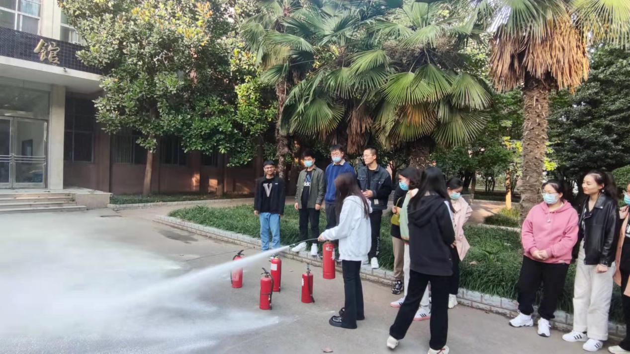 演练分为消防知识宣讲及灭火器使用操作两部分。首先由杨璟副院长强调防火的重要性及必然性,详细地讲解实验室遇到火情该如何冷静处理,并就干粉灭火器正确使用方法进行了现场讲解、示范、指导,强调使用灭火器要保持镇静,遇到火情千万不要慌乱失措,牢记“一晃、二拉、三压、四喷”要领,掌握正确的使用方法,提高自救自护能力。之后同学们在杨璟副院长和王巧艳老师的指导下进行实际操作。同学们严格遵守灭火器使用步骤,认真学习实际操作,每个人都参与并成功完成了一次灭火器使用流程。