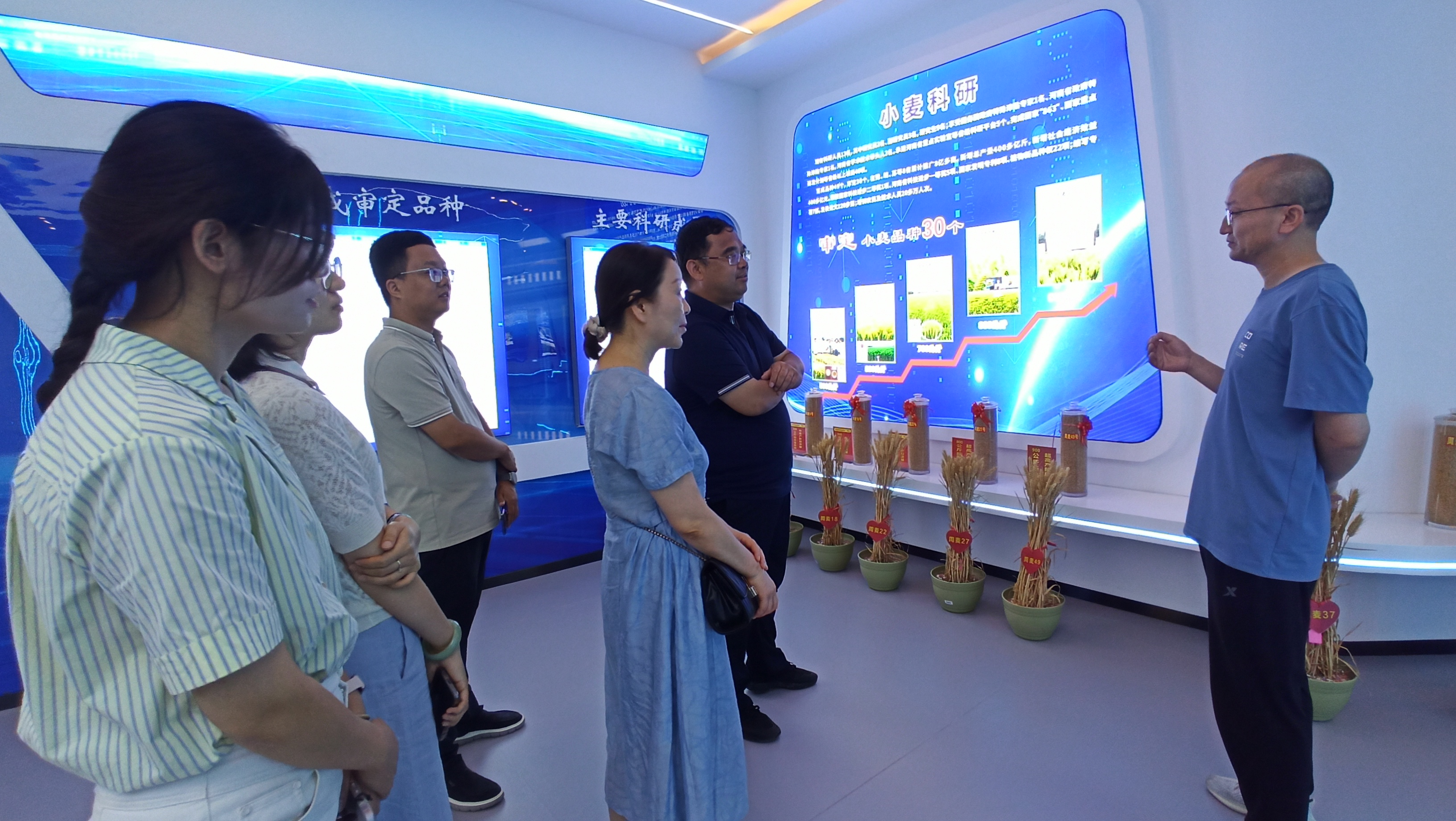 在周口市农业科学院,王宜伦一行依次参观了智慧岛种业实验室、宣传展厅、试验基地,并与周口市农业科学院院长杨青春、副院长贾朝阳、资源环境与畜牧研究所所长黄洪波等相关负责同志开展座谈交流。双方负责人分别介绍了本单位基本情况和科研项目研究进展,并表示将以此次考察交流为契机,在人才培养、科技创新、社会服务等方面加强交流合作。