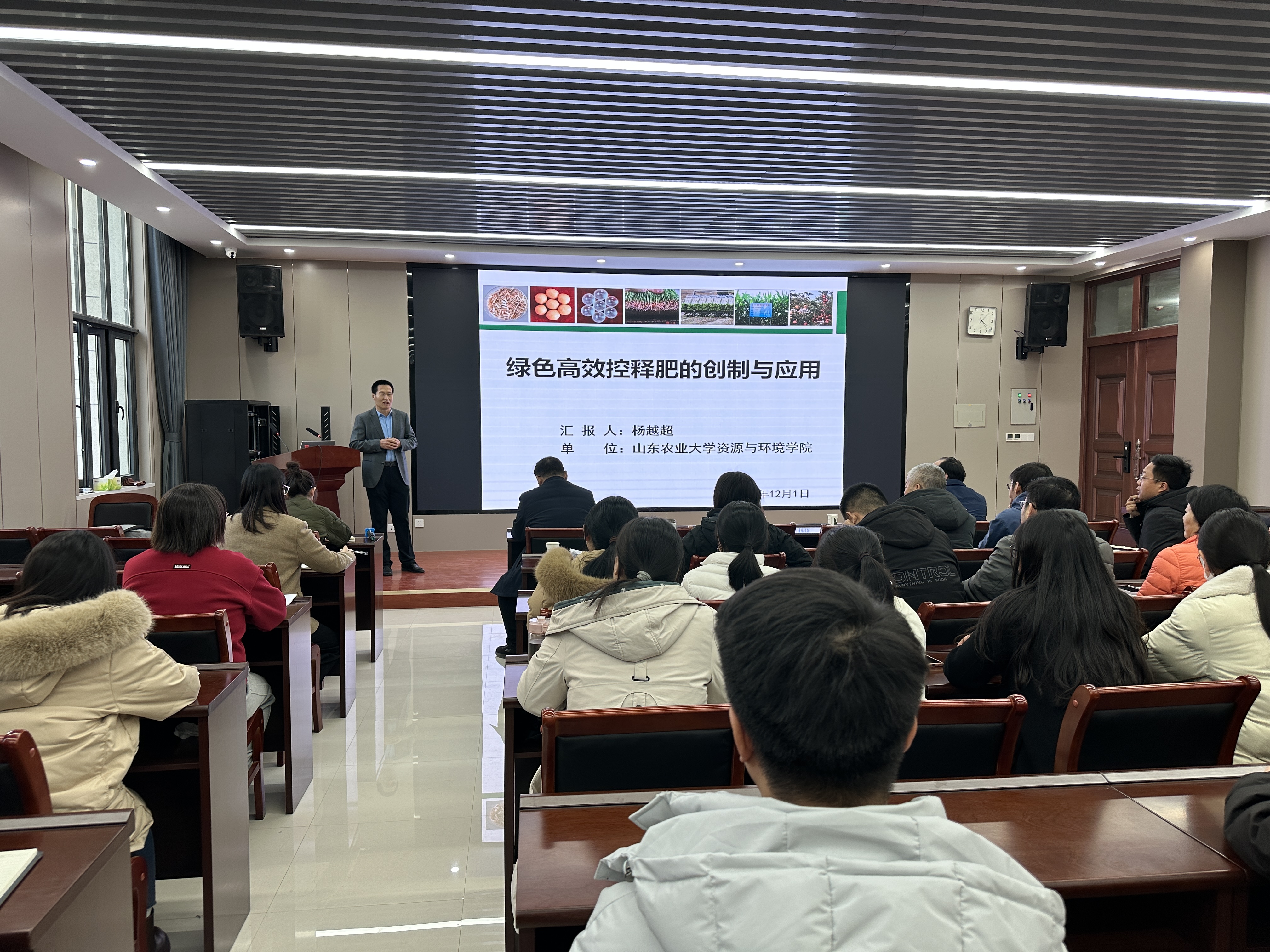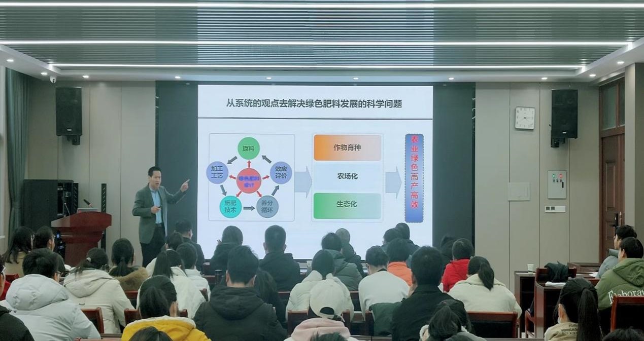师生作“绿色高效控释肥的创制与应用”学术报告,院长王宜伦教授主持,副院长刘世亮、学院部分教师和研究生参加了报告会。