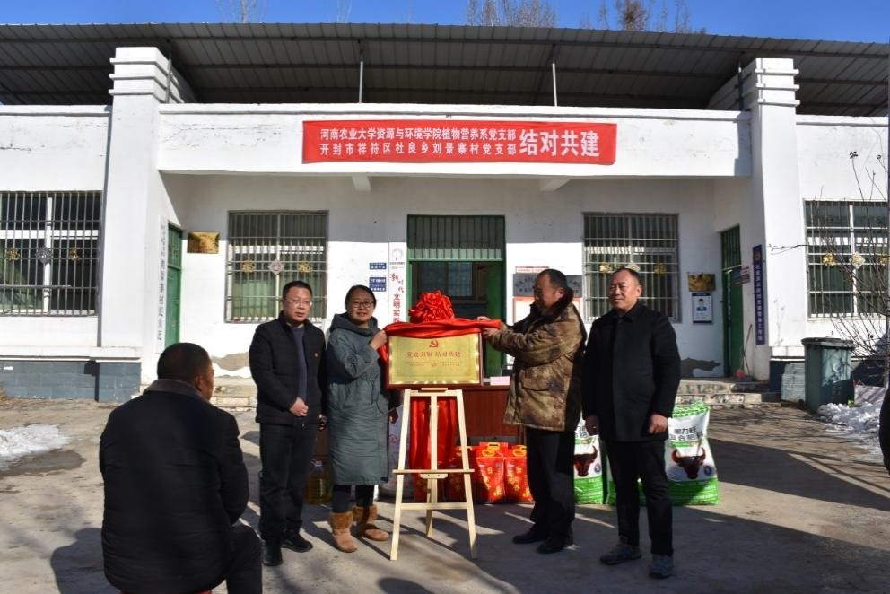 双方党支部书记共同为结对共建揭牌。植物营养系党支部向刘景寨村捐赠肥料和农技书籍。