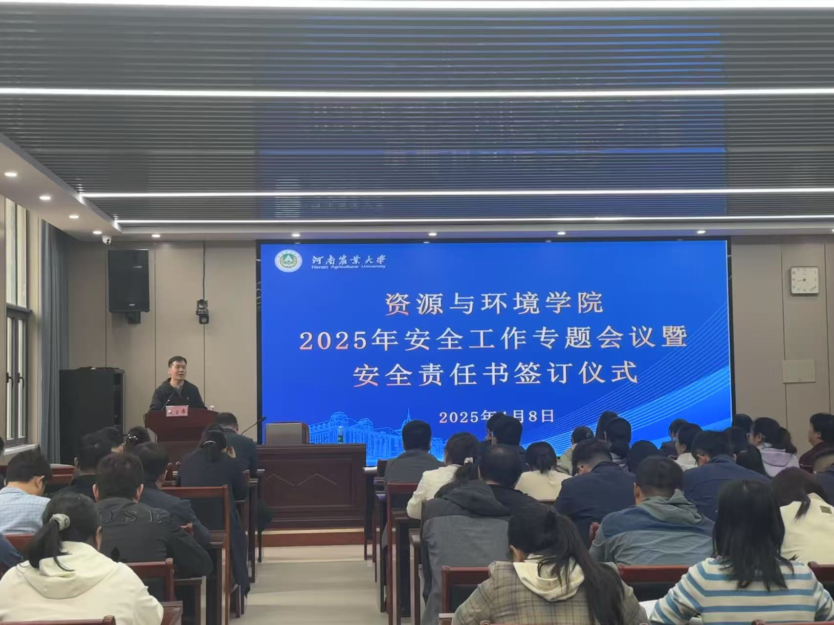 在力行楼-中-338报告厅召开了2025年安全工作专题会议暨安全责任书签订仪式。学院领导班子、全体教职工参加,会议由院党委书记李兴道主持。