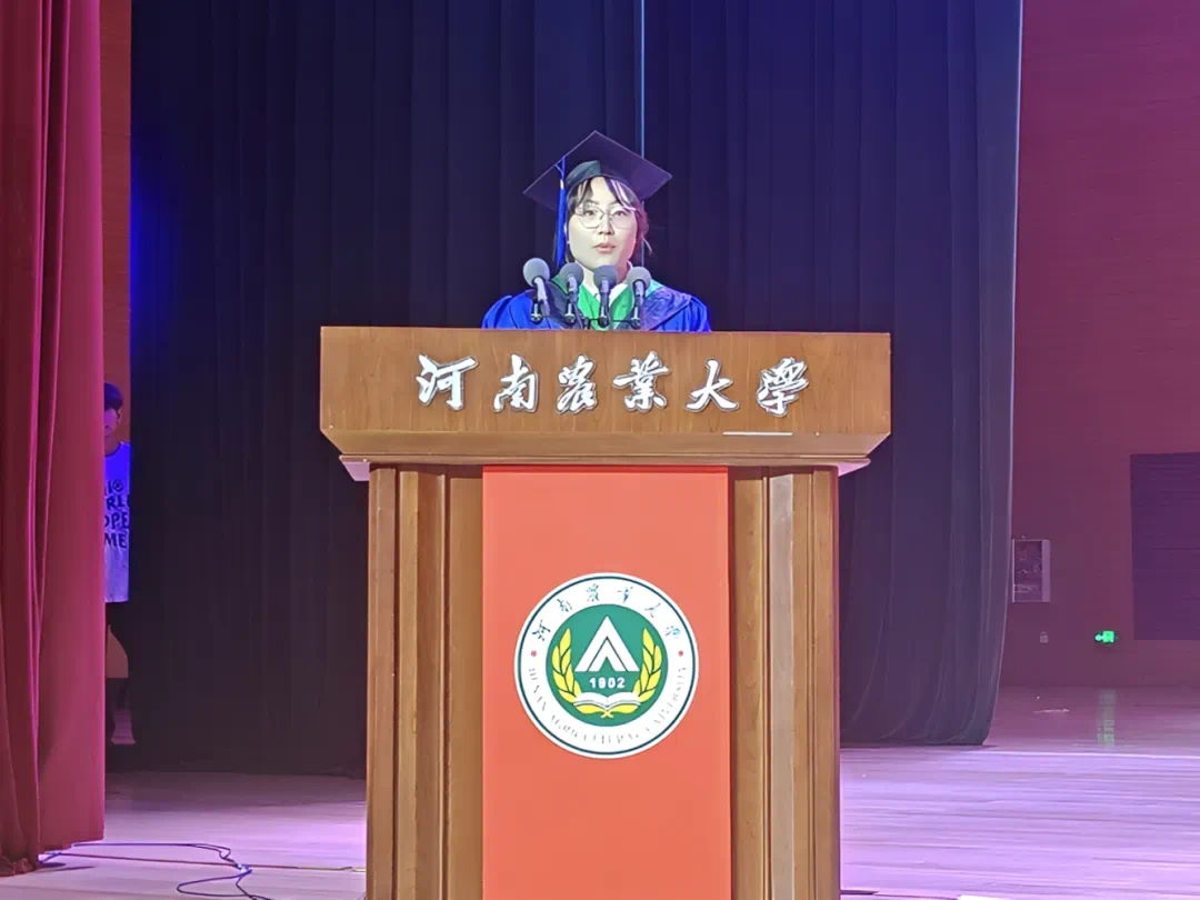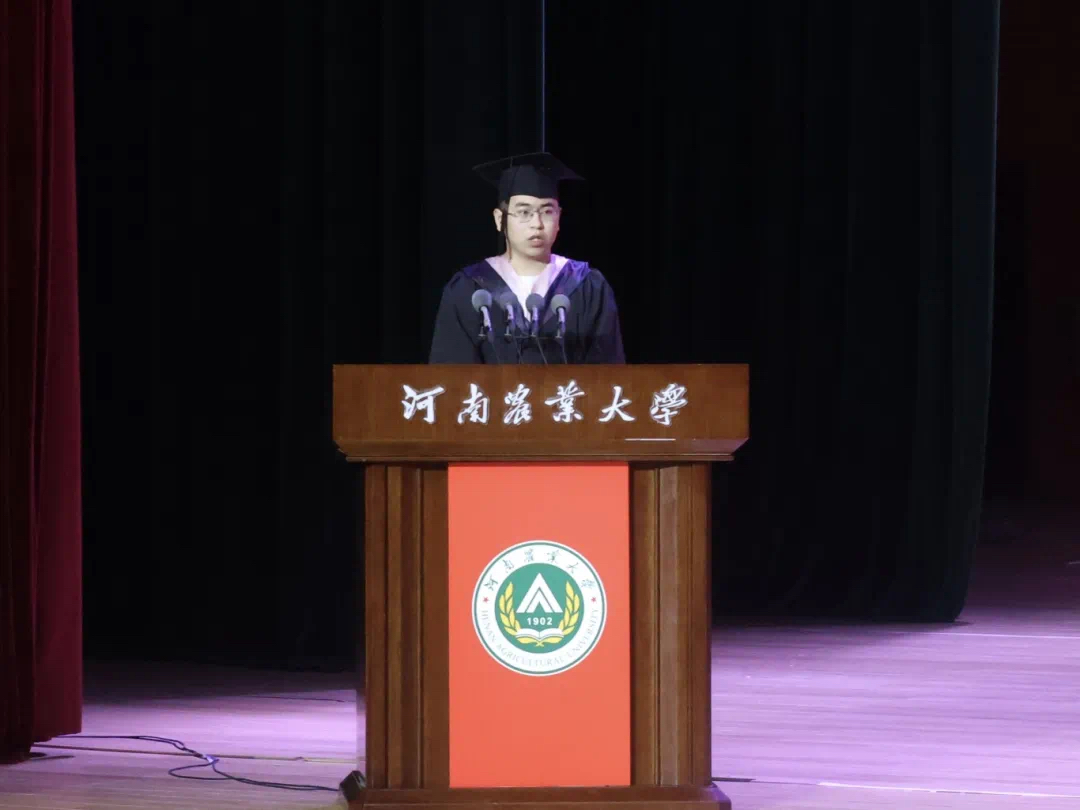 2022级农业资源与环境专业的曹钰敏同学上台发言,为2025届毕业生送上了诚挚祝福的同时,表示自己将不断汲取优秀榜样力量,持续书写好自己与农大的青春故事。土地资源管理专业的薛海腾、资源利用与植物保护专业的胡雪铃分别毕业生代表发言,他们通过回顾在农大的学习成长经历,表达了对学校和老师的感激之情,表示会时刻牢记农大人的时代使命,不断为农业发展、乡村振兴贡献青春力量!