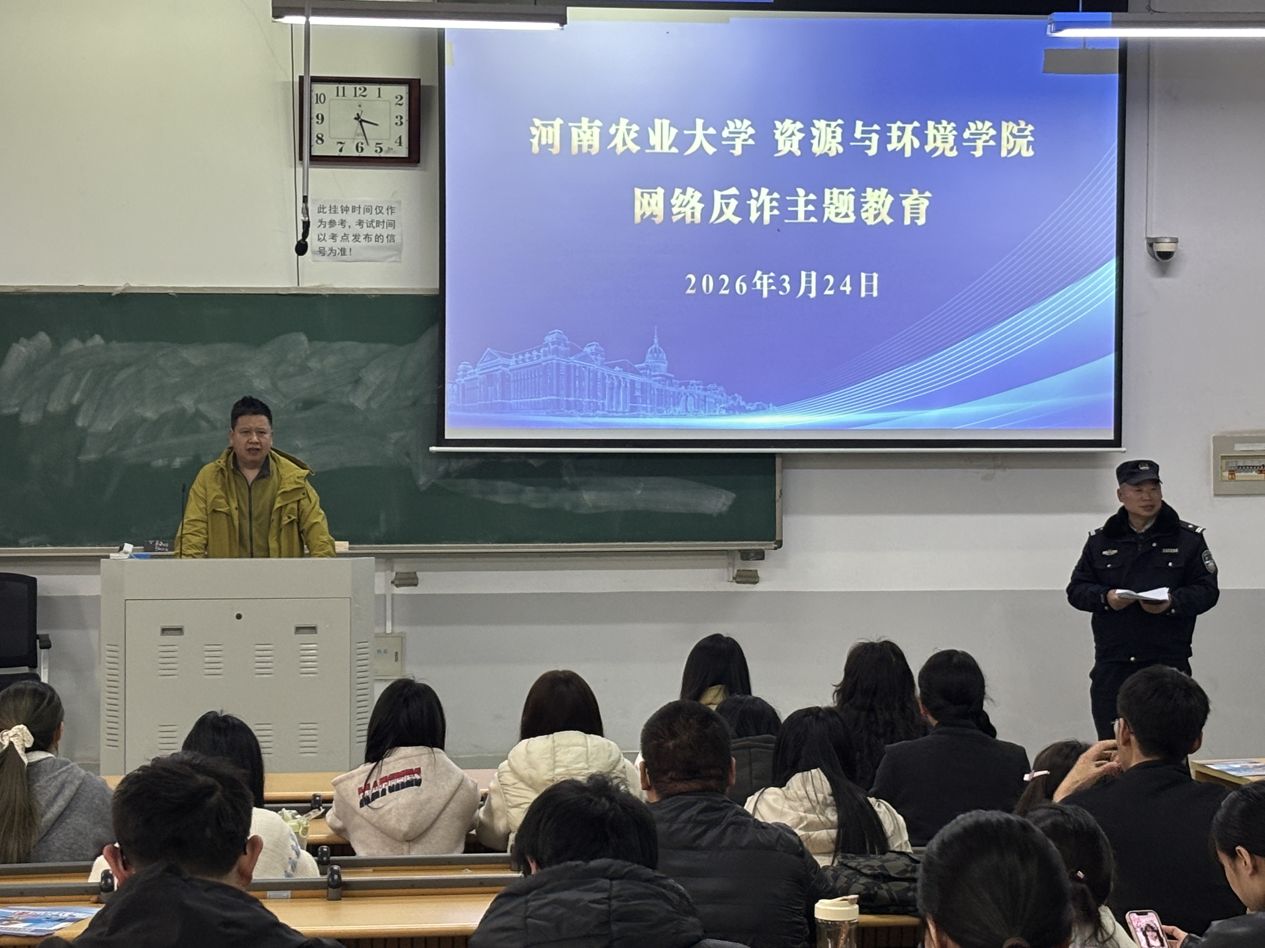 联合保卫处于繁塔楼D102教室举行“强化反诈宣传教育,共建平安文明校园”网络反诈主题安全教育。郑东新区公安分局及龙子湖派出所的郑警官应邀担任主讲,各年级宿舍长参与此次主题教育。