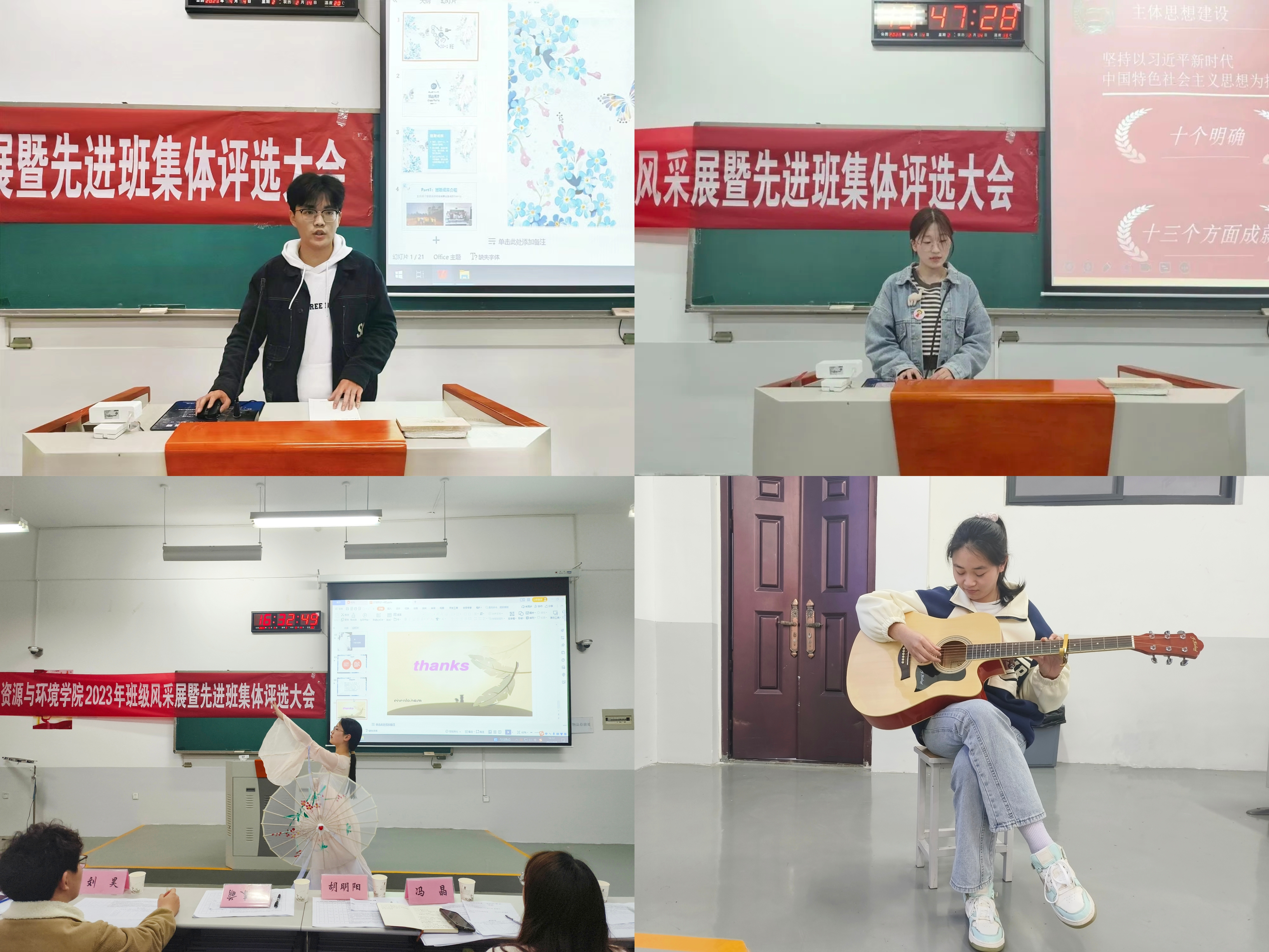 本次评选分为PPT汇报、才艺展示两个环节。各班汇报人首先从学风建设、实践活动、所获成绩和荣誉、未来展望等方面进行展示班级风采;其次各班代表们通过才艺表演环节,充分展现班级昂扬的精神风貌,并不断将活动推向高潮,赢得在场师生的热烈掌声。最后,胡明阳老师作总结:一是希望同学们珍惜交流机会,学习优秀班级的建设方式;二是积极开展有益活动,促进同学之间的感情交流;三是班委要做好本职工作,引导本班学生遵守学院规章制度,养成良好的班风班貌。